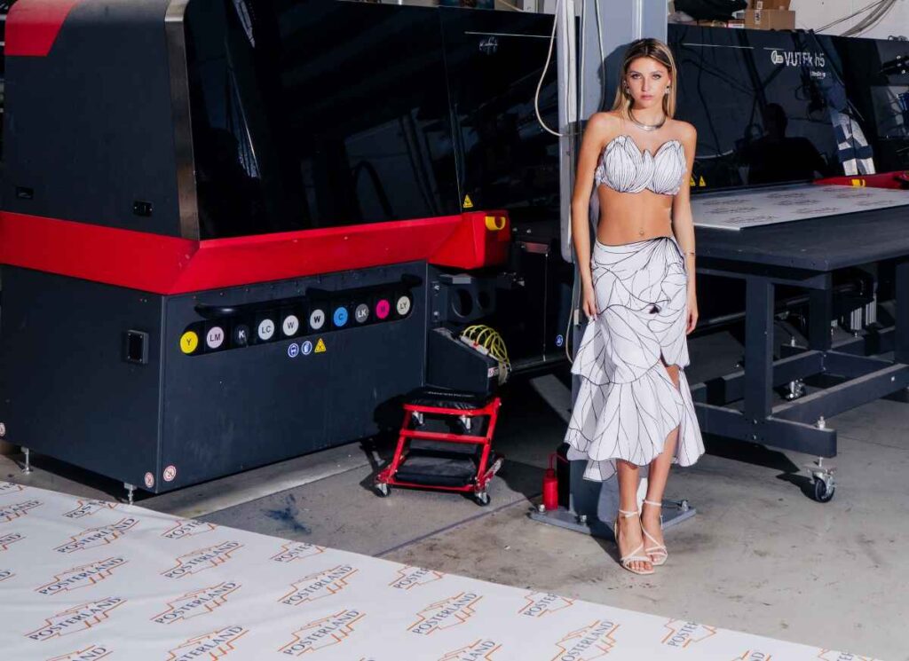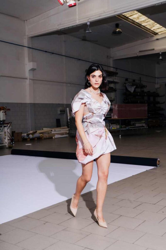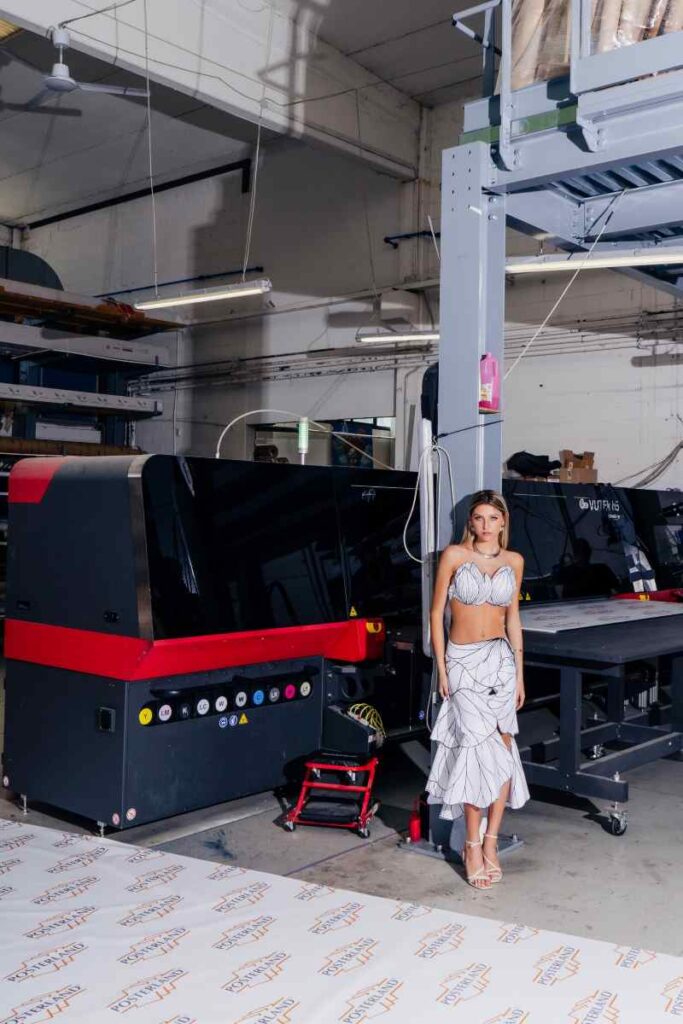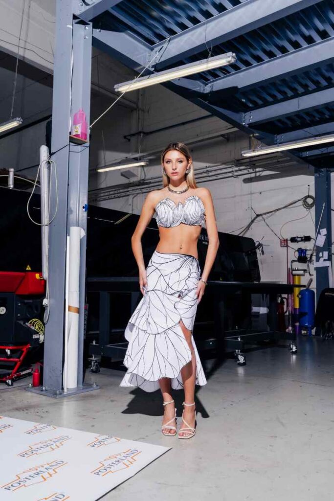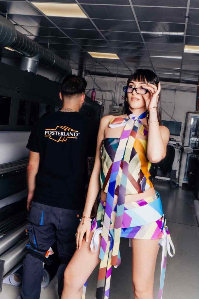 Fondata nel 1995 da Pascale Lacrouts, Posterland è oggi una delle realtà più riconosciute in Italia nella stampa digitale su misura per l’interior decoration e la comunicazione visiva. Specializzata in carte da parati personalizzate, vetrofanie, tessuti stampati, pellicole decorative e soprattutto maxi affissioni, l’azienda ha trasformato il concetto di personalizzazione degli spazi in un linguaggio visivo unico, capace di valorizzare brand, eventi e ambienti. Per celebrare questo importante traguardo, Posterland ha realizzato un progetto speciale: reinterpretare tre delle sue texture storiche – una per ogni decennio – e trasformarle in abiti attraverso la stampa su tessuto non tessuto. I capi sono stati ideati e tagliati da Marta Poli, giovane designer della NABA e indossati da tre modelle durante uno shooting fotografico realizzato proprio all’interno dell’azienda, tra macchinari, superfici in lavorazione e persone al lavoro.
